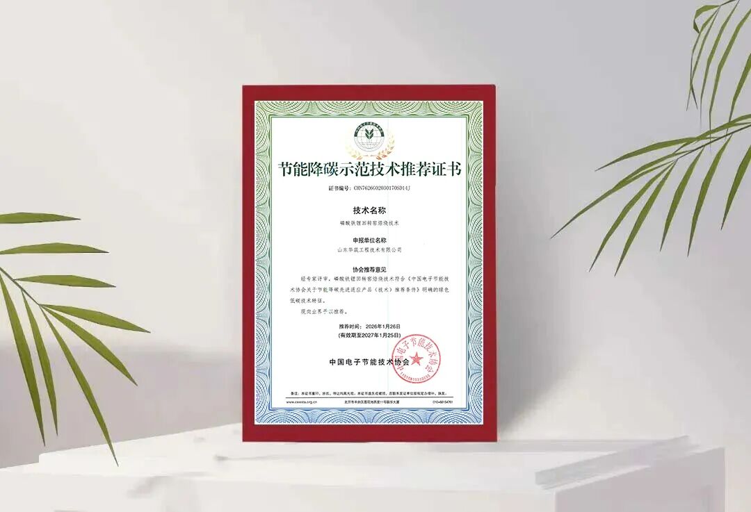 Recently, the China Electronics Energy Saving Technology Association officially released the "National Energy Saving and Carbon Reduction Demonstration Product Technology Recommendation List." Two products applied for by Shandong Huayi Engineering Technology Co., Ltd. (hereinafter referred to as "Huayi Engineering"), namely the "Lithium Iron Phosphate Rotary Kiln Roasting Technology" and the "Premise Lithium Technology for Black Powder from Battery Recycling," were successfully selected, highlighting the company's technical strength and industry benchmark status in the field of energy saving and carbon reduction.