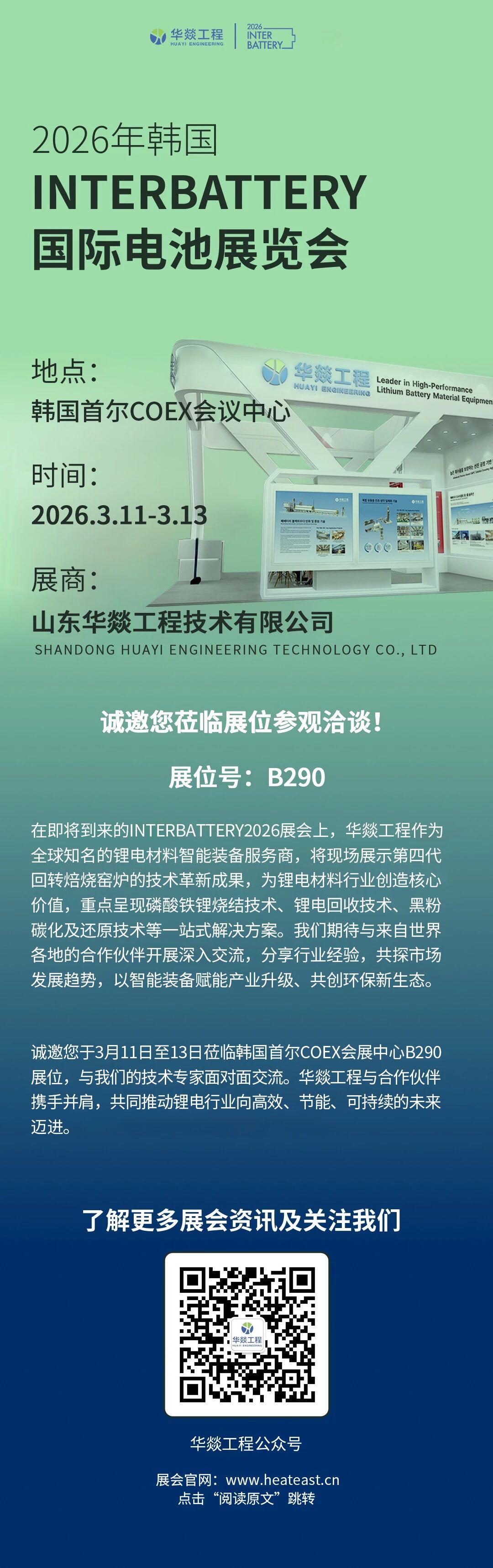 Spring opens in Seoul, join the grand event! The highly anticipated InterBattery 2026 (Seoul International Battery & Energy Storage Exhibition) will be grandly held from March 11 to 13, 2026, at the COEX Convention Center in Seoul, South Korea. As a leader in high-end equipment for new energy lithium battery materials, Shandong Huayi Engineering Technology Co., Ltd. will attend the exhibition with its core products and innovative technologies, sincerely inviting industry peers and partners from around the world to visit the booth, explore directions for battery technology innovation, and jointly expand new opportunities for global new energy cooperation!