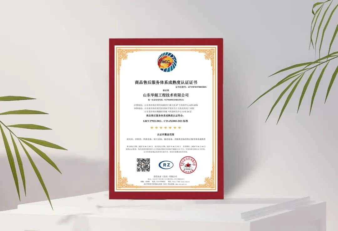 Recently, Shandong Huayi Engineering Technology Co., Ltd. (hereinafter referred to as "Huayi Engineering") successfully passed the national standard GB/T 27922-2011 "Commodity After-sales Service Evaluation System" and CTS JX1003-2021 maturity certification evaluation, thanks to its comprehensive after-sales service system and excellent service quality, and was awarded the Seven-Star After-sales Service Maturity Certification.