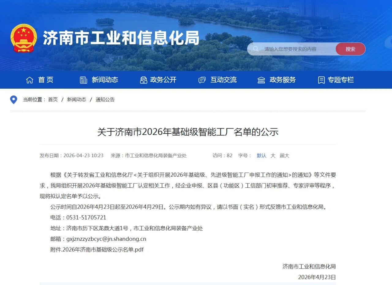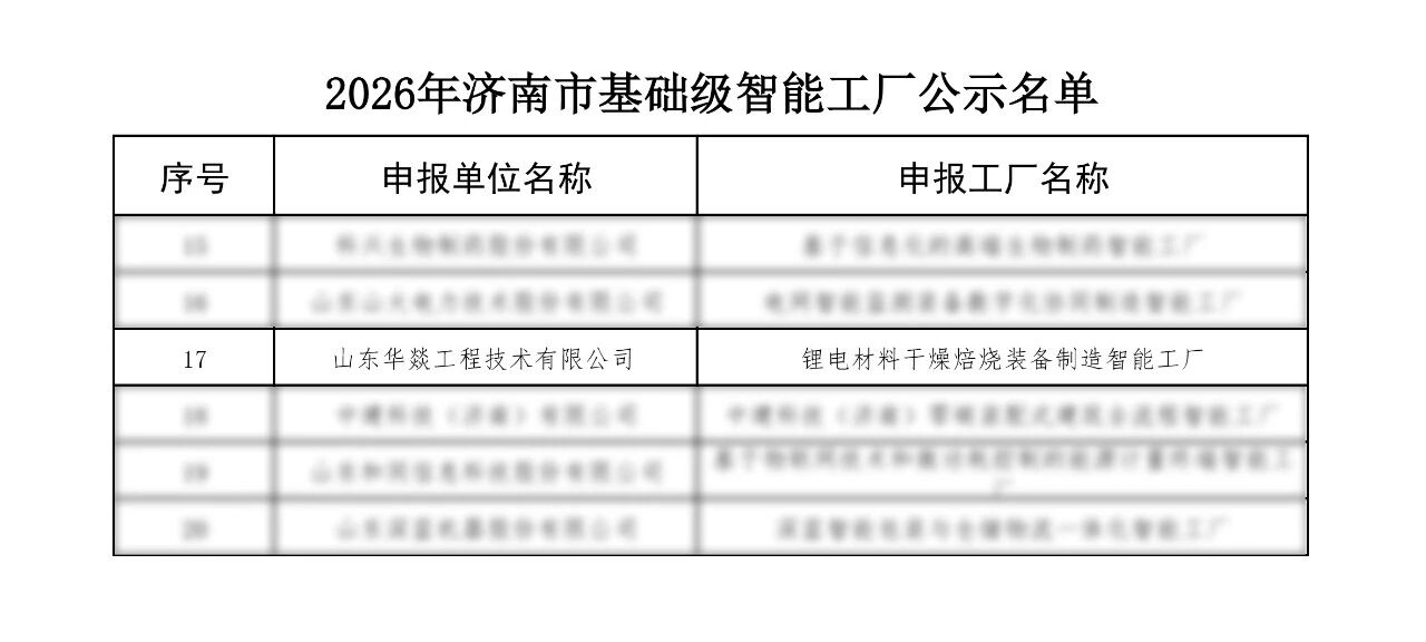 Recently, the Jinan Municipal Bureau of Industry and Information Technology released the "Announcement on the List of Basic-Level Intelligent Factories in Jinan for 2026." Shandong Huayi Engineering Technology Co., Ltd., with its project "Intelligent Factory for Manufacturing Lithium Battery Material Drying and Roasting Equipment," was successfully selected for the 2026 list of basic-level intelligent factories in Jinan!